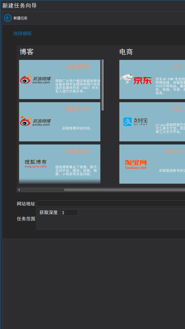 模板选择:根据不同的目标网站,选择相应的任务模板,可以个性化选择参数配置。网站模板分为几个大的种类:博客类、电商类、境外类、论坛类、网盘类、邮箱类等。
