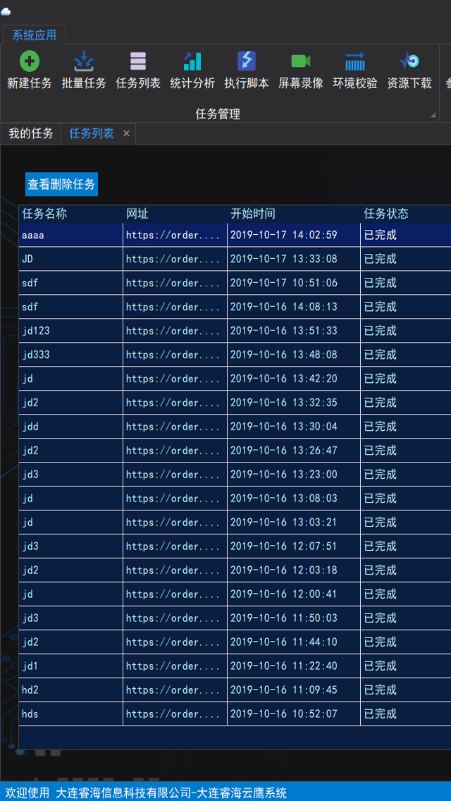 任务信息:可显示任务列表信息,以及其他操作。可以查看截图、获取的URL、任务目录、校验码查询、重新执行任务、删除任务等操作。