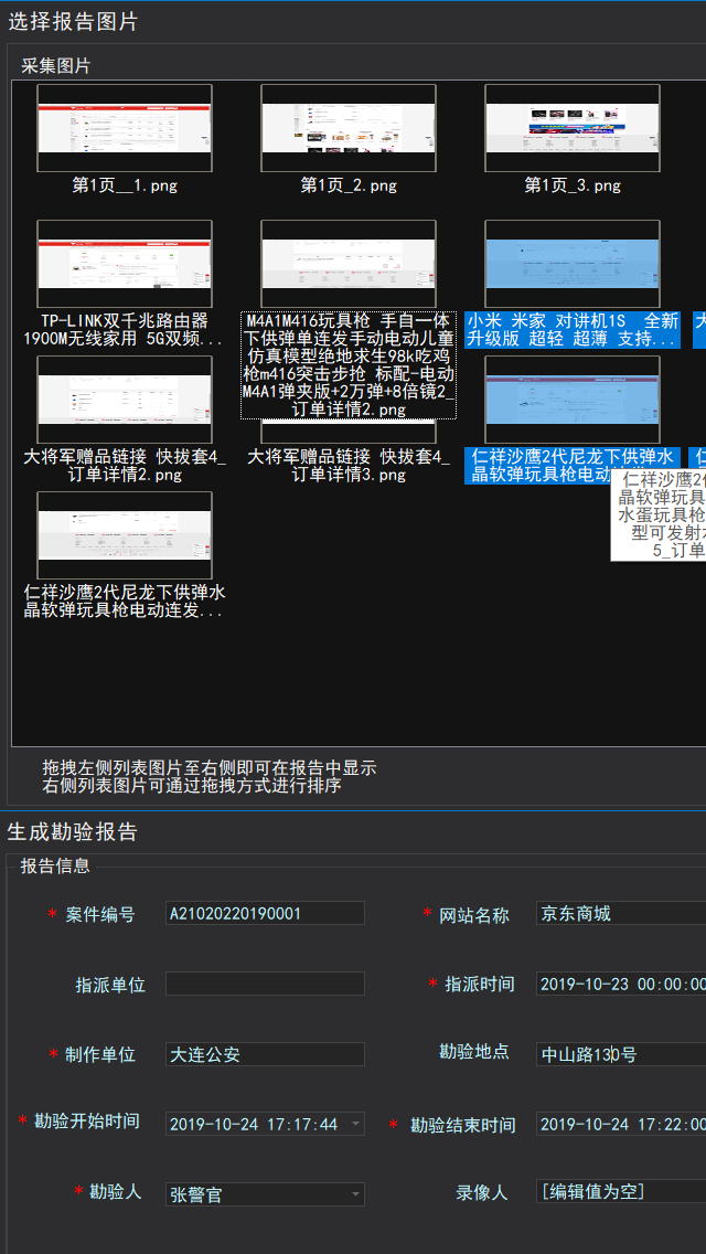 可以自动生成勘验报告。填写必要的报告信息,可以批量选中截图插入到报告中,截图顺序支持手动排序,并自动生成报告。